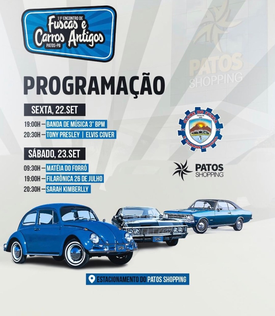 O Encontro de Fuscas e Carros Antigos no Patos Shopping é mais do que um evento, é uma celebração da história sobre quatro rodas, um tributo aos carros que fizeram história e continuam conquistando corações. Não perca essa oportunidade de fazer parte dessa jornada nostálgica e emocionante, onde o passado e o presente se encontram sob o céu do sertão paraibano. O Patos Shopping funciona de segunda a sábado, das 10h às 22h. Domingos e feriados, das 12h às 22h.