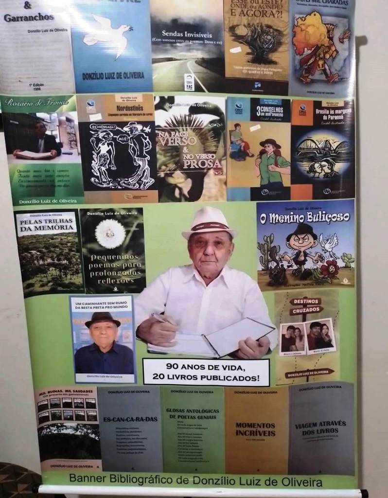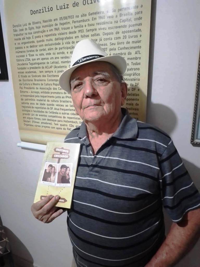 Reconhecido em Brasília-DF como o Mestre das Artes do Sertão, Donzílio Luiz de Oliveira recebeu grande homenagem em agosto deste ano, pelos seus 90 anos. Renomado poeta, cordelista, repentista e escritor nascido em 1933 no Sítio Gameleira, no município de Itapetim, ele lançou recentemente na capital federal o seu vigésimo livro, intitulado “Destinos Cruzados”, cuja obra vem fazendo sucesso.