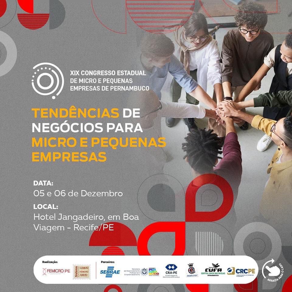 Está chegando a hora! Nos dias 5 e 6 de dezembro, o Recife será palco de um evento imperdível para empreendedores ávidos por inspiração e inovação: O XIX Congresso Estadual das Micro e Pequenas Empresas de Pernambuco, que vai reunir especialistas e líderes ligados ao setor, bem como, empreendedores de sucesso para compartilhar suas experiências, insights e estratégias de sucesso.