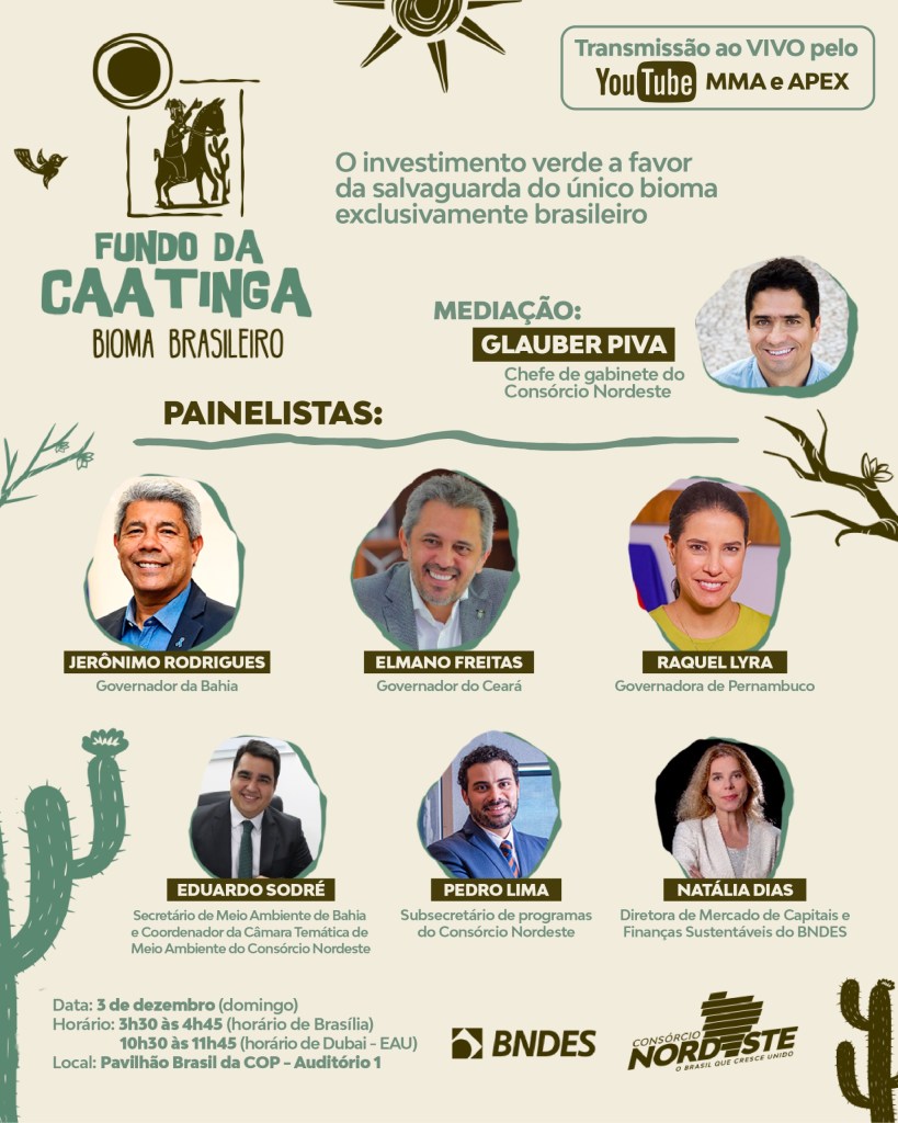 – Dia 3 de dezembro (domingo), durante a COP, ocorrerá o painel “O Fundo Caatinga – o investimento verde a favor da salvaguarda do único bioma exclusivamente brasileiro”, de 3h30 às 4h45 (horário de Brasília) / 10h30 às 11h45 (horário de Dubai – EAU), com a presença de representantes do Nordeste e do BNDES e será transmitido no YouTube da MMA e APEX. Aos que estiverem em solo árabe, a palestra acontecerá no Pavilhão Brasil da COP – Auditório 1 (segue flyer em anexo).