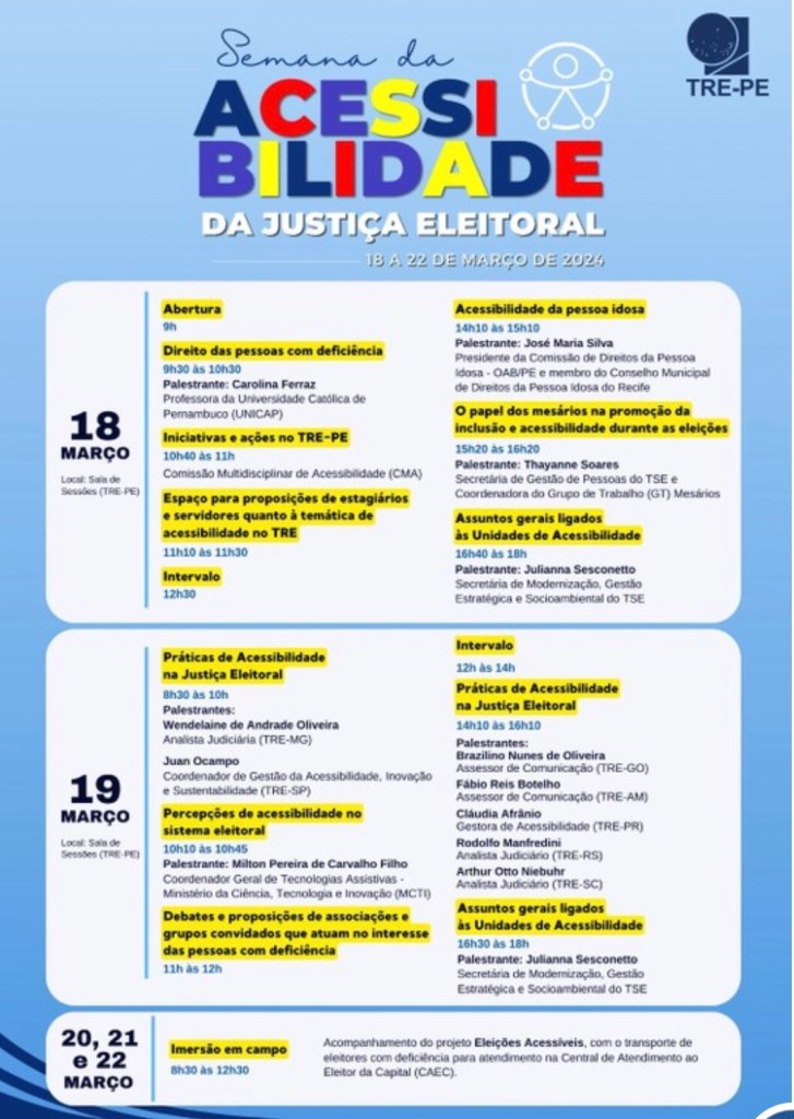 Estão previstas palestras sobre Direito da Pessoa com Deficiência, com a palestrante Carolina Ferraz da Universidade Católica de Pernambuco (Unicap); Práticas de Acessibilidade, com os palestrantes, Wendelaine Oliveira (TRE-MG) e Juan Ocampo (TRE-SP); Percepções de Acessibilidade no Sistema Eleitoral, com Milton Pereira de Carvalho Filho, do Ministério de Ciência, Tecnologia e Inovação (MCTI), entre outras.
