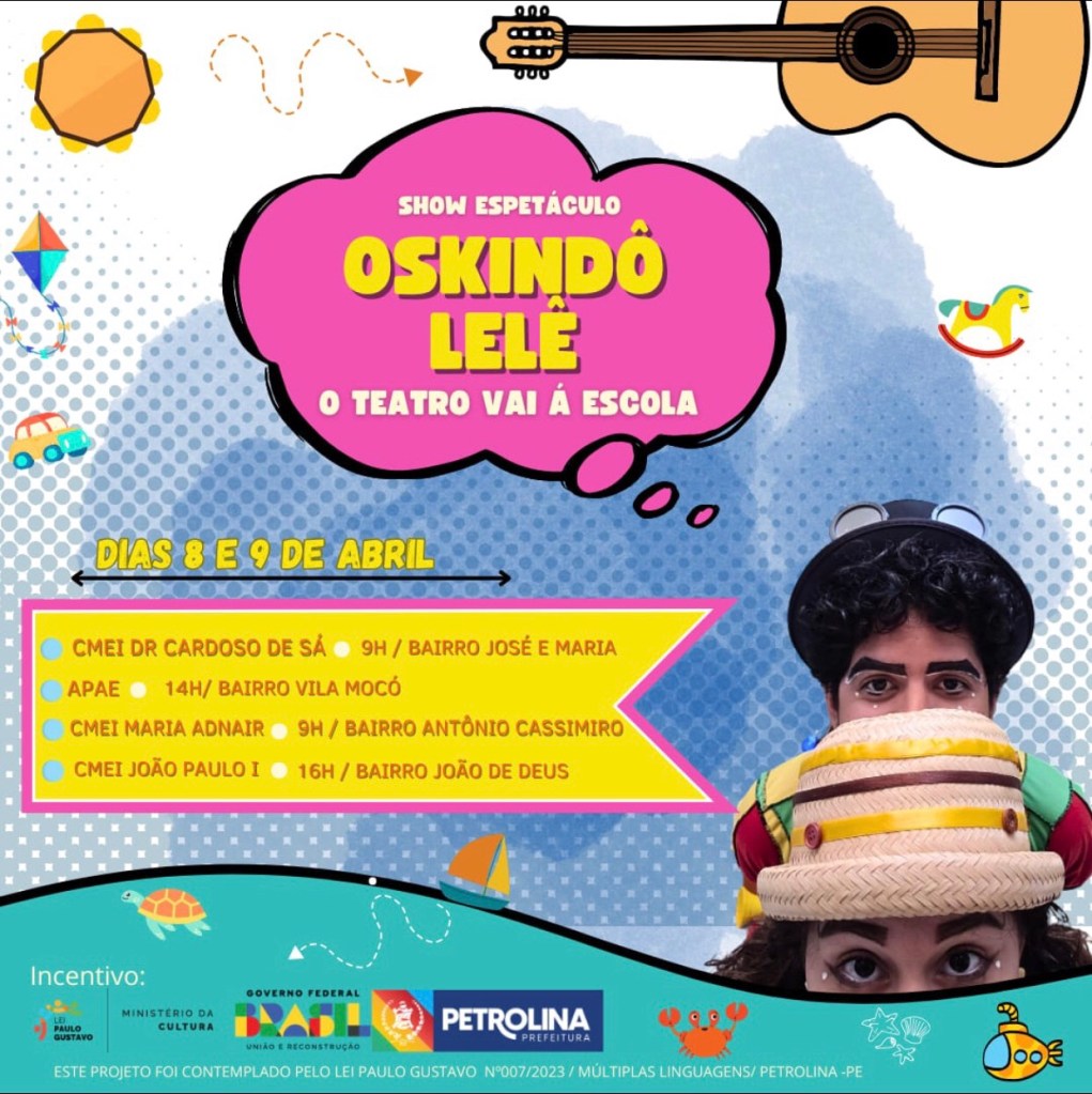 Na próxima semana, escolas públicas de Petrolina (PE) recebem o projeto “O Teatro vai à Escola”, que oferece apresentações gratuitas da obra “Oskindô-Lelê”. Quatro instituições serão contempladas na temporada, sendo as sessões nesta segunda-feira (8) e terça-feira (9), às 9h e 16h.