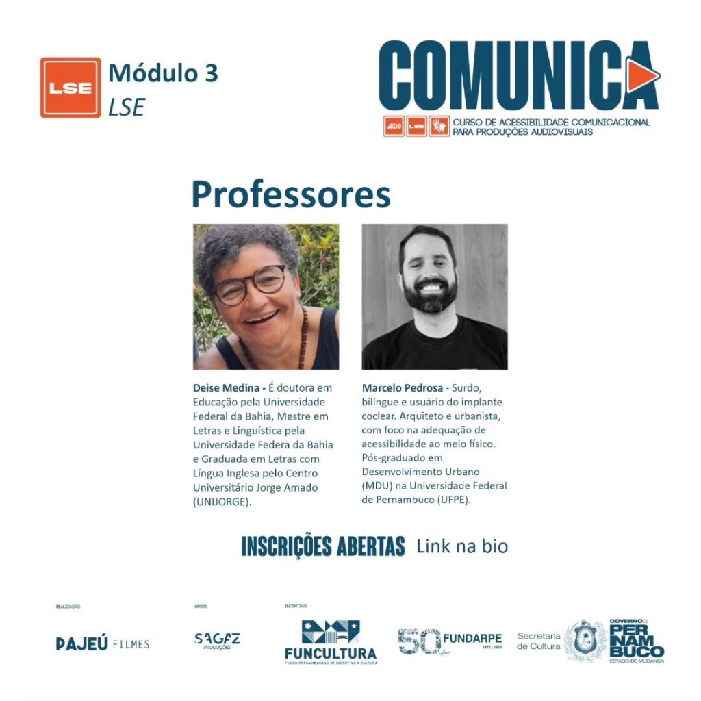 O projeto Comunica – Curso de Acessibilidade Comunicacional para Projetos Audiovisuais é uma produção da Pajeú Filmes, com incentivo do Funcultura, Fundarpe, Secretaria de Cultura e Governo de Pernambuco.