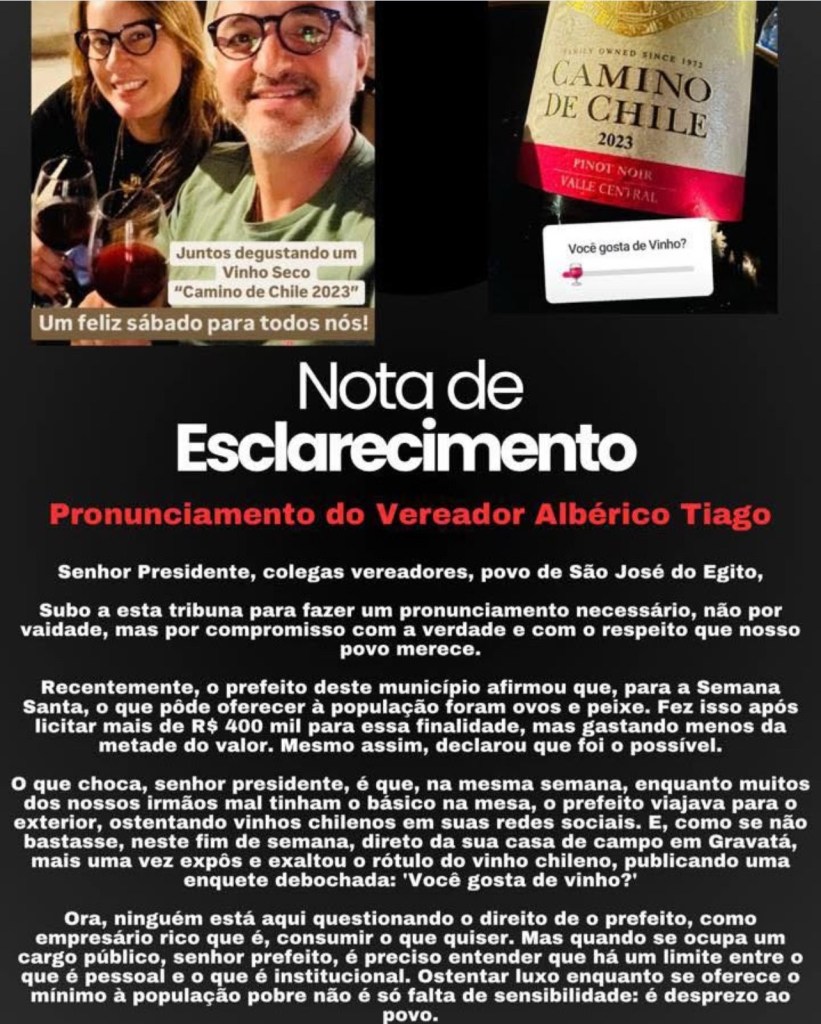 Uma postagem nas redes sociais do prefeito Fredson Brito, de São José do Egito (PE), gerou polêmica e forte reação na Câmara de Vereadores. A imagem, onde o prefeito aparece degustando um vinho chileno de safra 2023, ao lado da legenda “Um feliz sábado para todos nós!”, motivou um pronunciamento crítico do vereador Albérico Tiago, que acusou o gestor de insensibilidade diante das dificuldades enfrentadas pela população mais pobre do município.