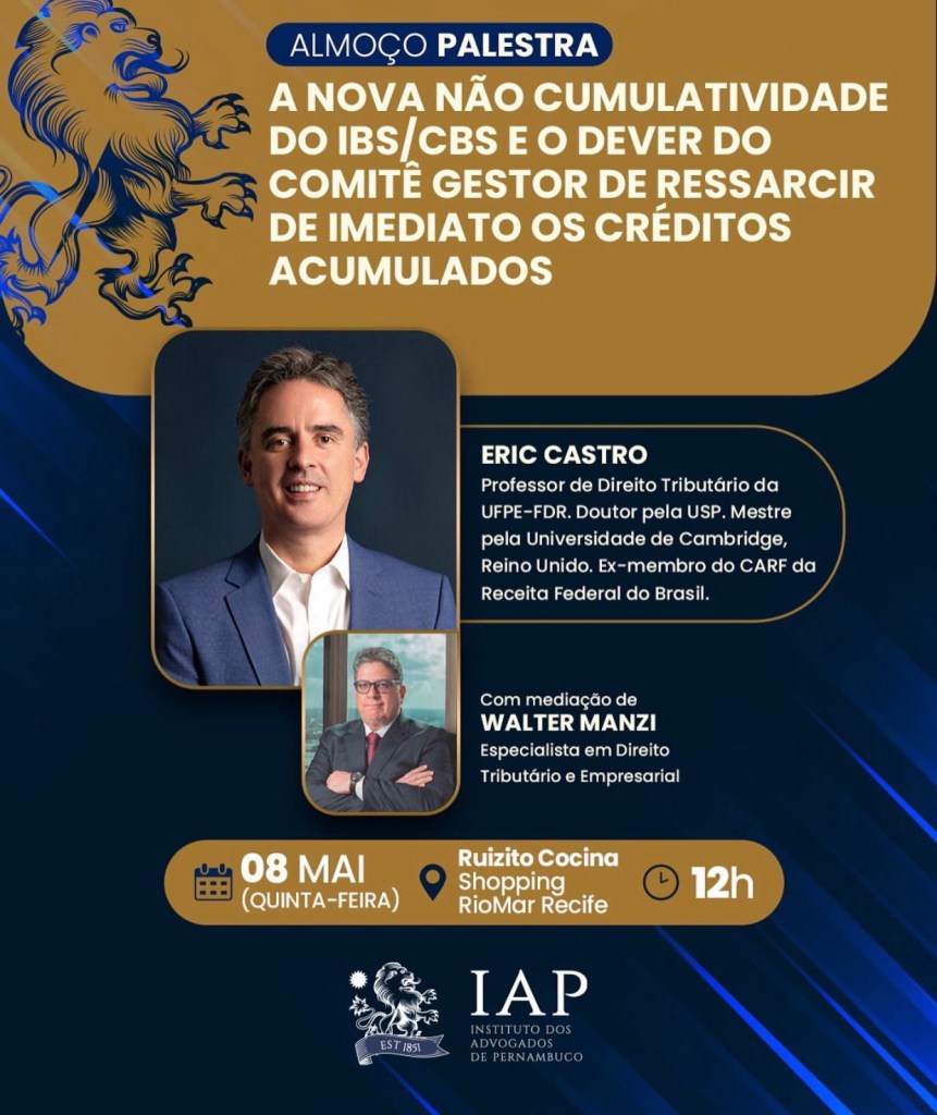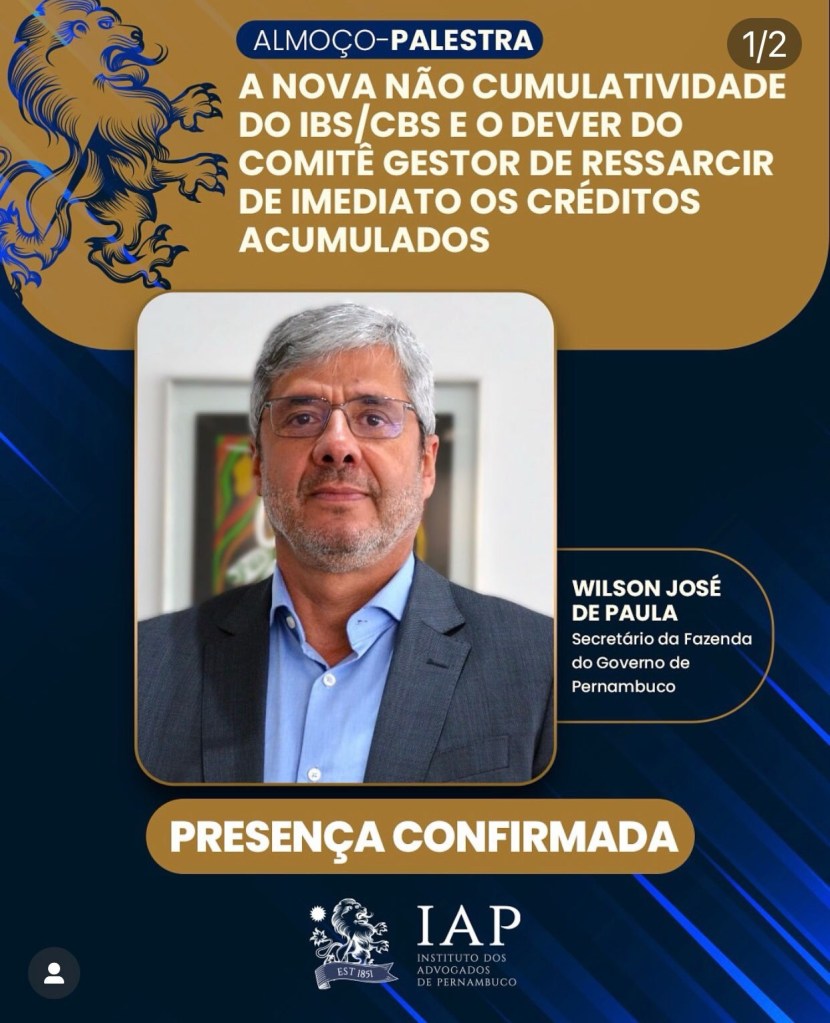 O Secretário da Fazenda Estadual, Wilson José de Paula confirma presença no almoço-palestra a ser realizado pelo Instituto dos Advogados de Pernambuco (IAP), nesta próxima quinta-feira (8), tendo o tributarista Erik Castro e Silva, vice-presidente do Instituto como palestrante sobre “A Nova não cumulatividade do IBS/CBS e o dever do Comitê Gestor de ressarcir de imediato os créditos acumulados”.