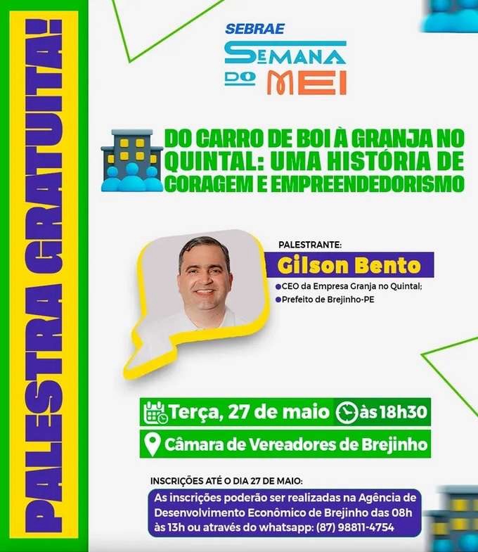 Dando continuidade à programação da Semana do MEI em Brejinho, no Sertão do Pajeú, o município receberá nesta terça-feira (27), às 18h30, uma palestra especial com o prefeito Gilson Bento, que também é CEO da empresa agropecuária “Granja no Quintal”. O evento será realizado na Câmara de Vereadores e promete ser um momento inspirador para os participantes.