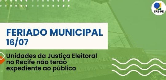 O Tribunal Regional Eleitoral de Pernambuco (TRE-PE) informa que não haverá atendimento ao público na modalidade presencial, nesta quarta-feira (16), nas unidades da Justiça Eleitoral do Recife, aqui incluídos a sede do Tribunal, cartórios eleitorais e Central de Atendimento ao Eleitor, em razão do feriado municipal em homenagem a Nossa Senhora do Carmo, padroeira da cidade.