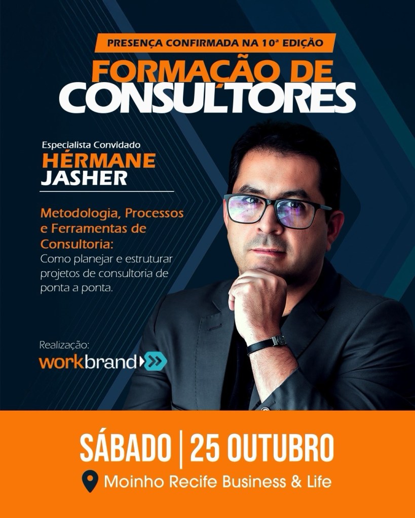 Na sequência, o especialista Hérmane Jasher conduzirá um módulo sobre metodologia, processos e ferramentas de consultoria, detalhando como planejar e estruturar projetos de ponta a ponta. A proposta é que o participante saia do workshop com clareza sobre como organizar sua consultoria e aplicá-la de forma prática e imediata.