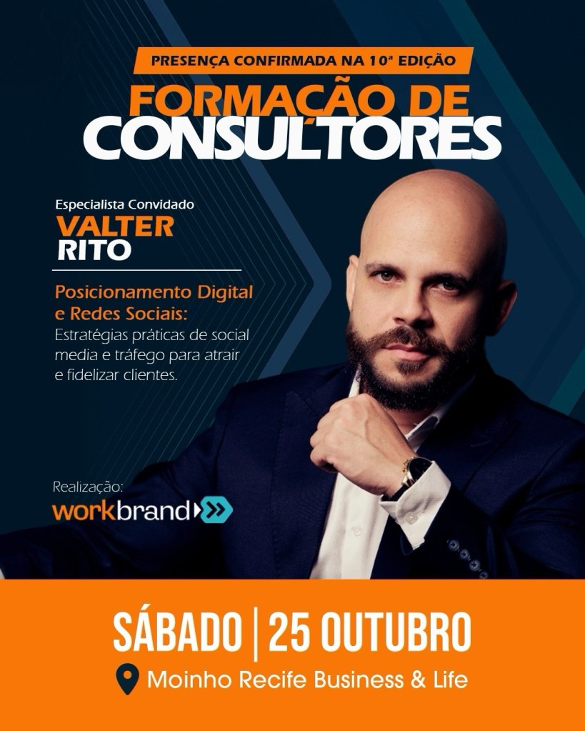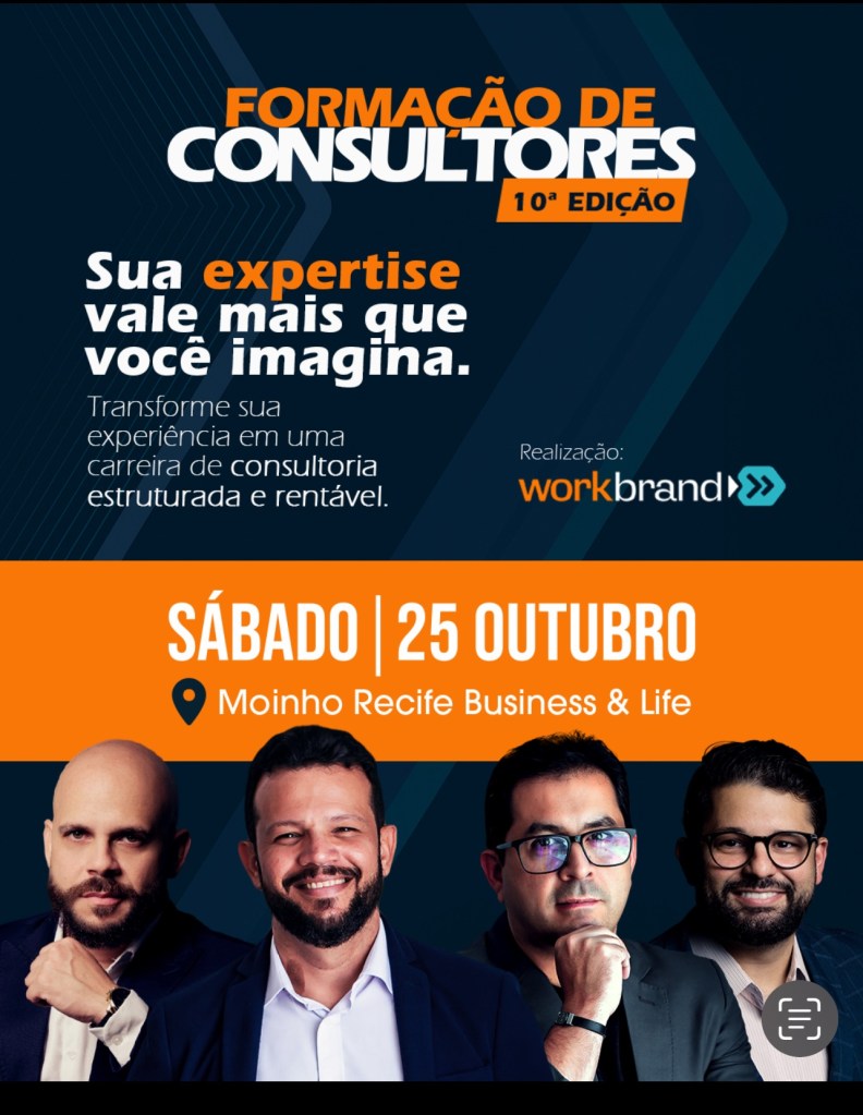 O Recife será palco, no próximo dia 25 de outubro, da 10ª edição do Workshop de Formação de Consultores, realizada pela Workbrand, no Moinho Recife Business & Life, na rua São Jorge, 240, Cais do Apólo/ Bairro do Recife. O encontro acontece das 9h às 16h e movimentará conteúdos que vão desde a estruturação de processos e contratos até estratégias de marketing digital e construção de autoridade pessoal.
