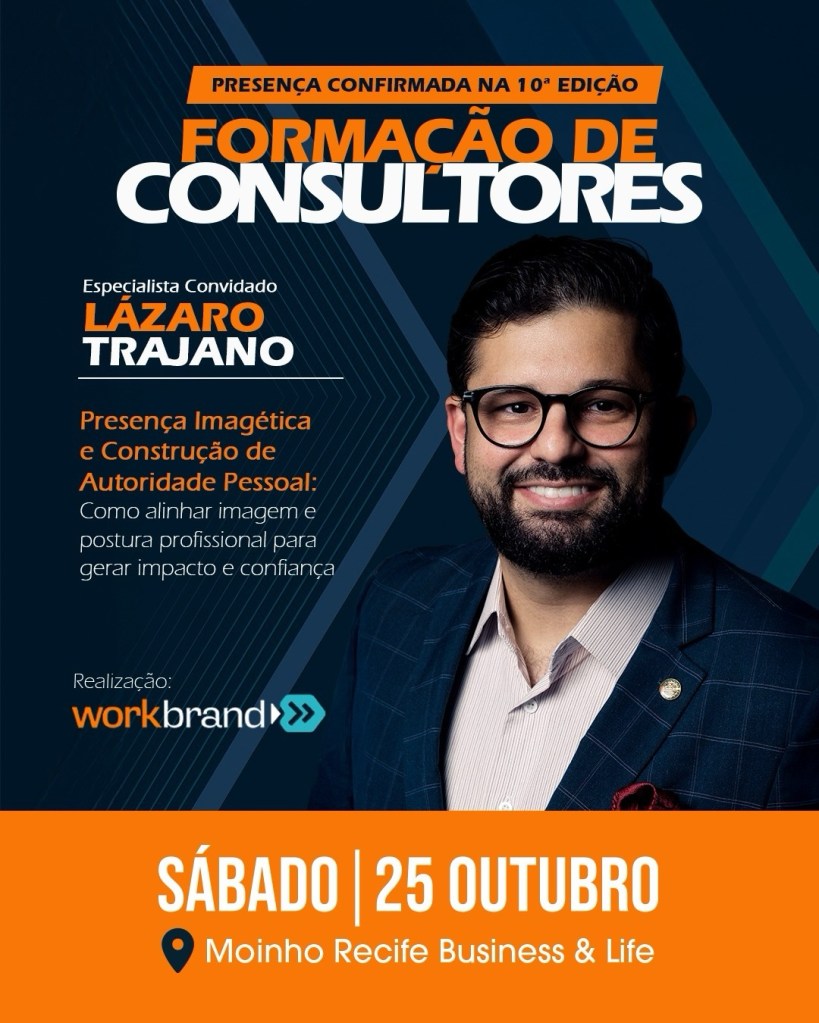 Por fim, o consultor Lázaro Trajano comandará o conteúdo sobre presença imagética e construção de autoridade pessoal, trazendo orientações sobre postura, imagem e comunicação profissional. O foco será ajudar cada participante a alinhar sua identidade pessoal à sua atuação como consultor, gerando impacto, credibilidade e confiança no mercado.