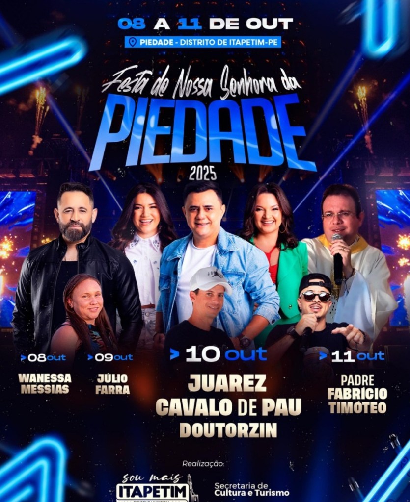 A Prefeitura de Itapetim, por meio da Secretaria de Cultura e Turismo, divulga a programação cultural da tradicional Festa de Nossa Senhora da Piedade. O evento será realizado entre os dias 8 e 11 de outubro e promete movimentar o distrito de Piedade com momentos de fé, alegria e valorização das tradições locais.