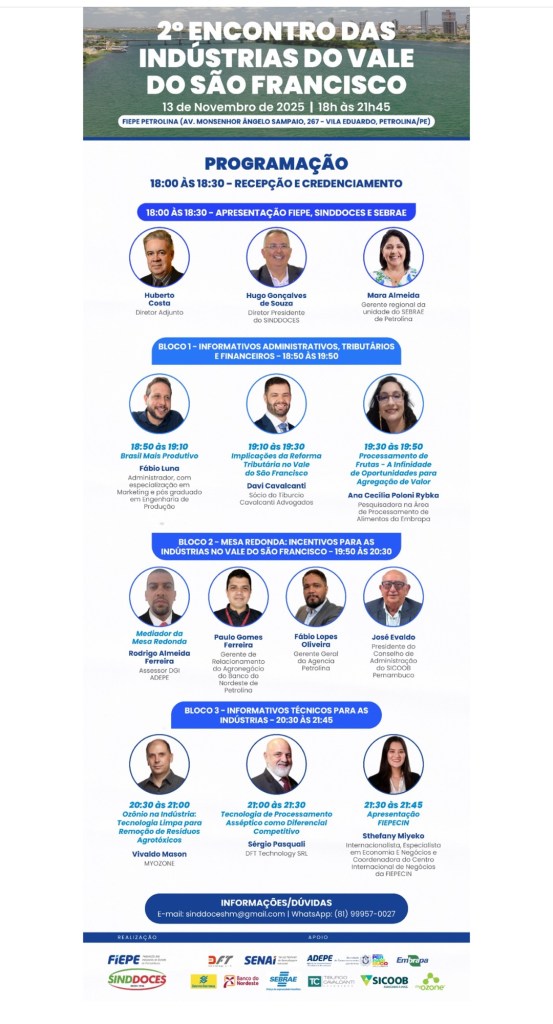 Inscrições gratuitas: https://agenda.fiepe.org.br/2encontrodasindustriasdovaledosaofrancisco-639694