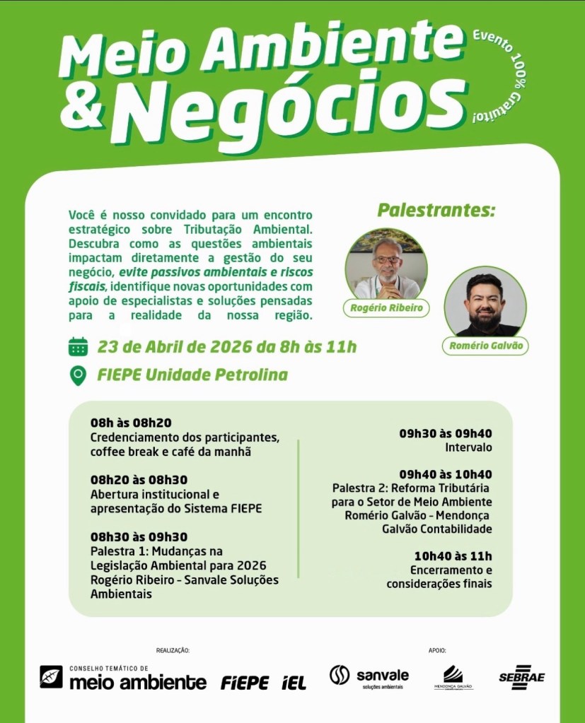 O evento vai acontecer no auditório da instituição das 8h às 11h, e vai reunir o CEO da Sanvale Soluções Ambientais, Rogerio Ribeiro, e o sócio e contador da Mendonça Galvão Contabilidade, Romério Galvão. A programação do evento contará com uma abertura institucional do Sistema FIEPE e com palestras sobre as mudanças na Legislação Ambiental para 2026 e a Reforma Tributária para o setor de meio Ambiente.